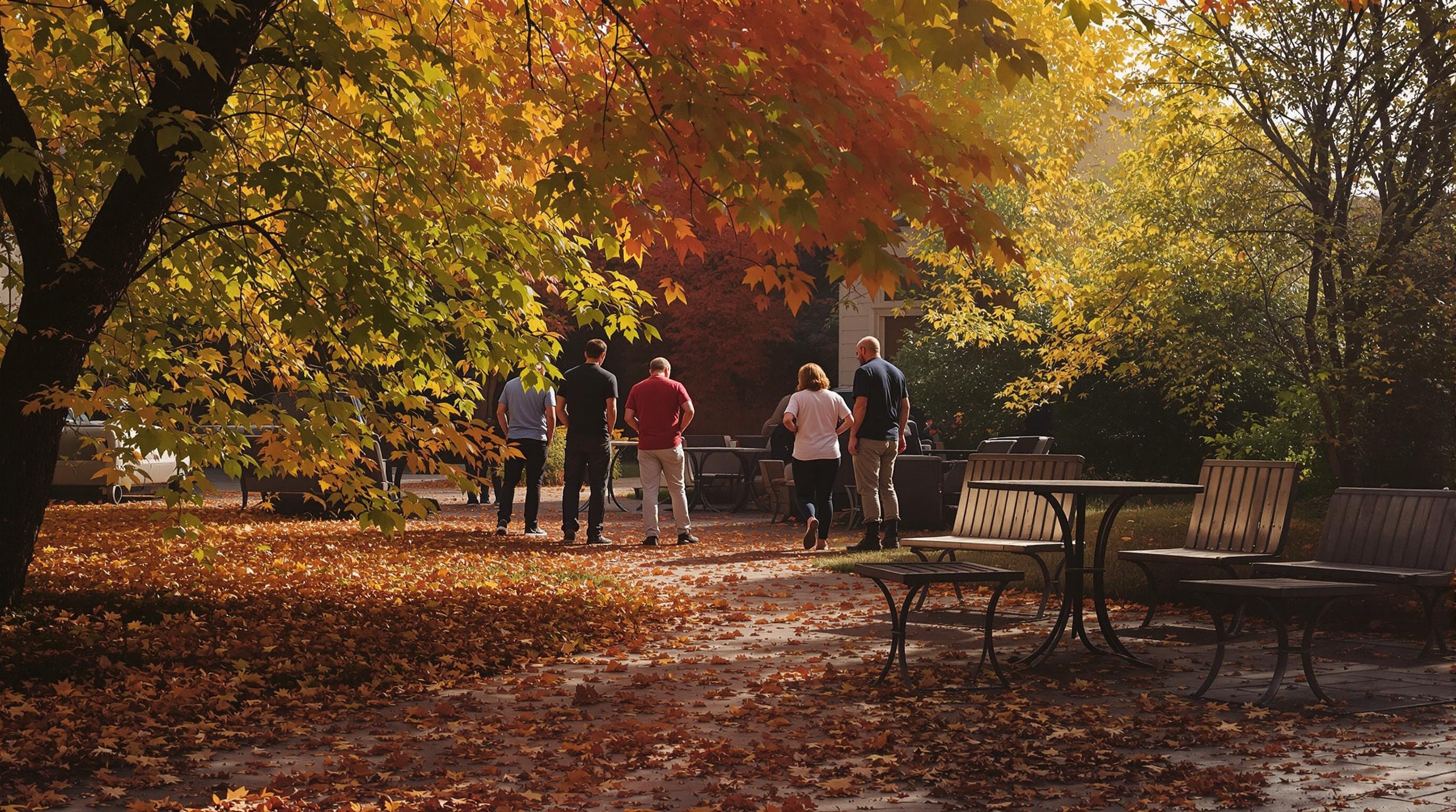 Feedback: The image depicts a peaceful autumn scene with people walking among colorful leaves, which aligns with the peaceful aspect of the prompt. However, it lacks any elements that convey tension, making it not fully representative of the desired prompt.
