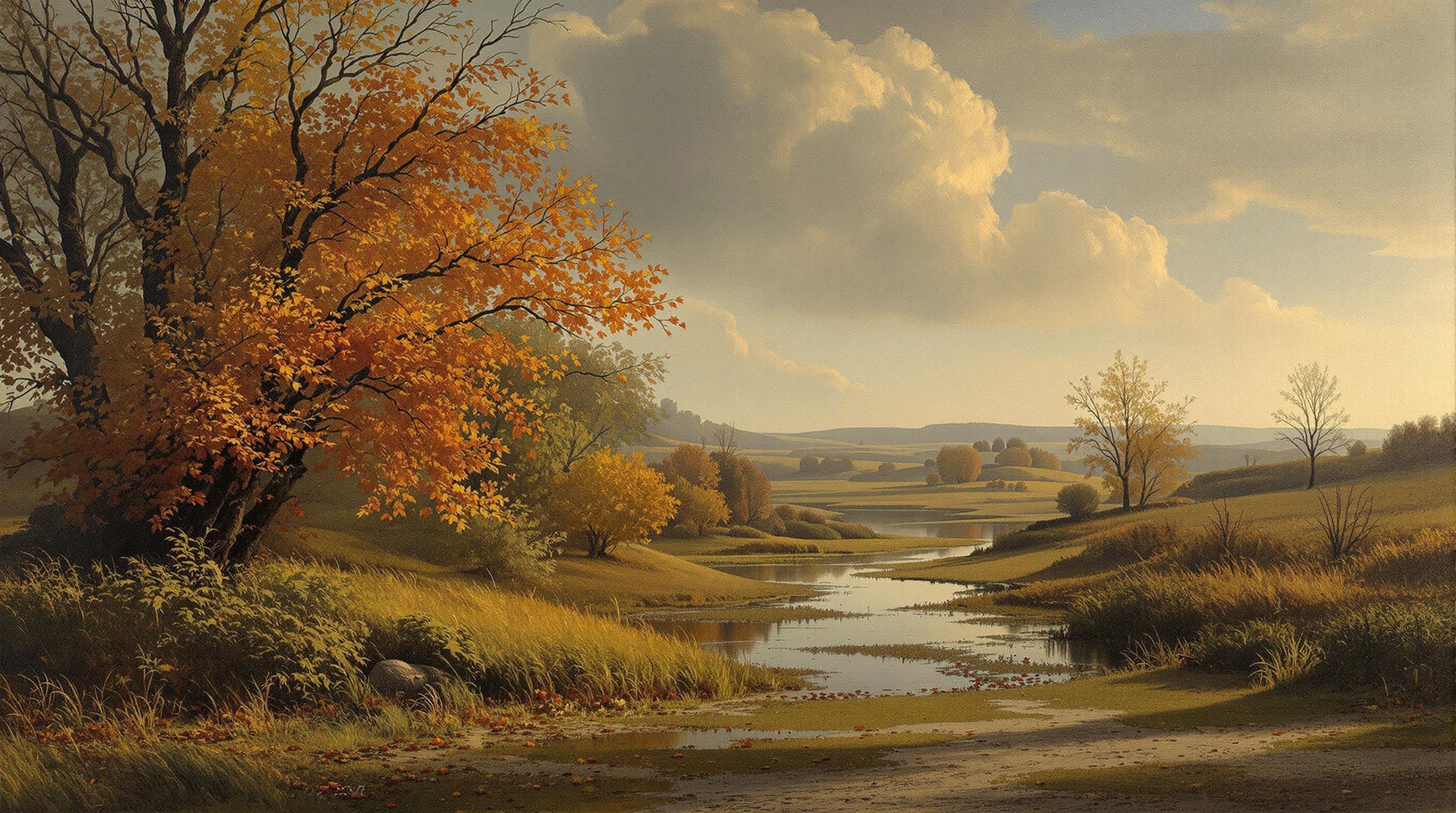 Feedback: The image depicts a serene autumn scene with warm colors and soft lighting, which aligns with the peaceful aspect of the desired prompt. However, it lacks elements that evoke tension or unease, making it not fully meet the requirement for a scene that is both peaceful and tense.